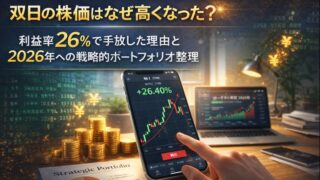双日の株価はなぜ高くなったのか?上昇の背景にある「中期経営計画2026」と株主還元を徹底解説。利益率26%で売却した私の「25%利確ルール」に基づいた投資判断と、2026年に向けた戦略的なポートフォリオ整理の舞台裏を公開します。