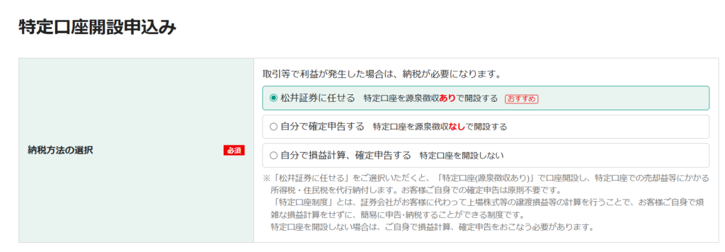 特定口座をおススメします。特定口座であれば、利益が発生しても確定申告をする手間がありません。