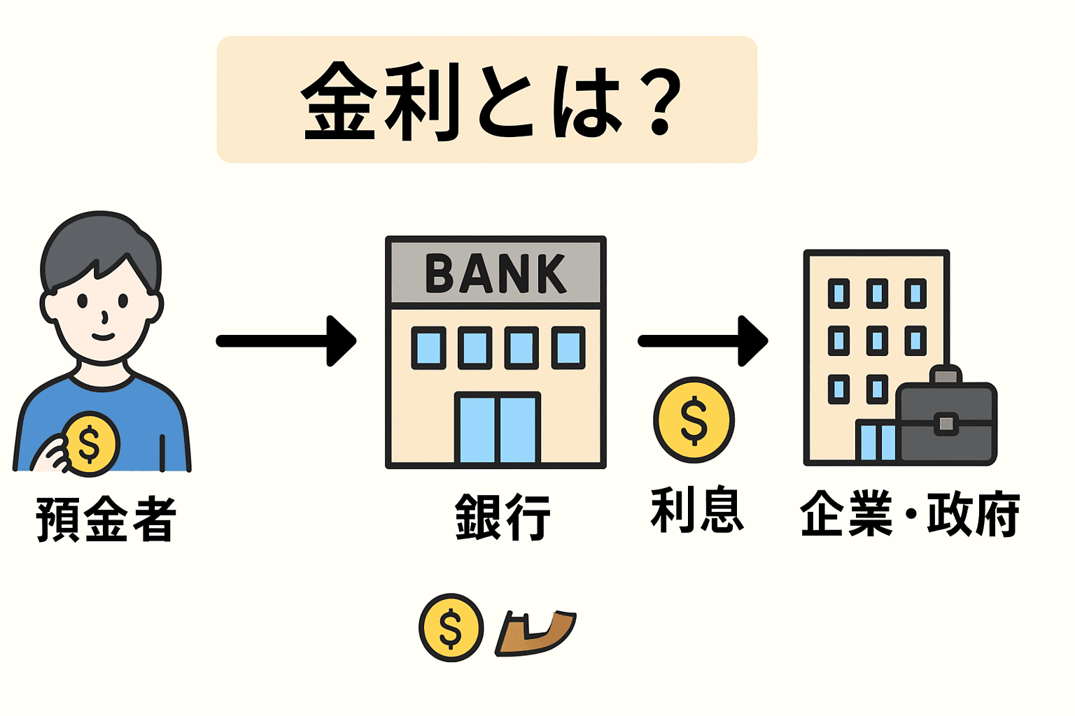 金利とは「お金を借りるコスト」のこと。銀行に預けると利息がもらえるのも、誰かがそのお金を借りているからです。