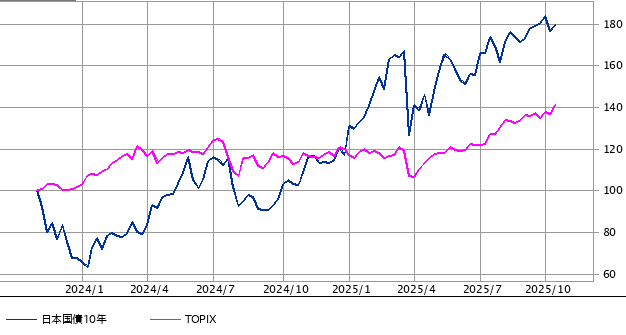 以下は、 日本10年国債利回りとTOPIXの推移グラフになります。