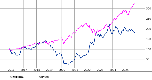 以下は、 米国10年債利回りとS&P500の推移グラフになります。