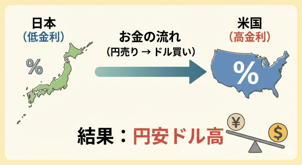 以下の図は、日本とアメリカの金利差がどのように「円安」を引き起こすかを示したものです。
