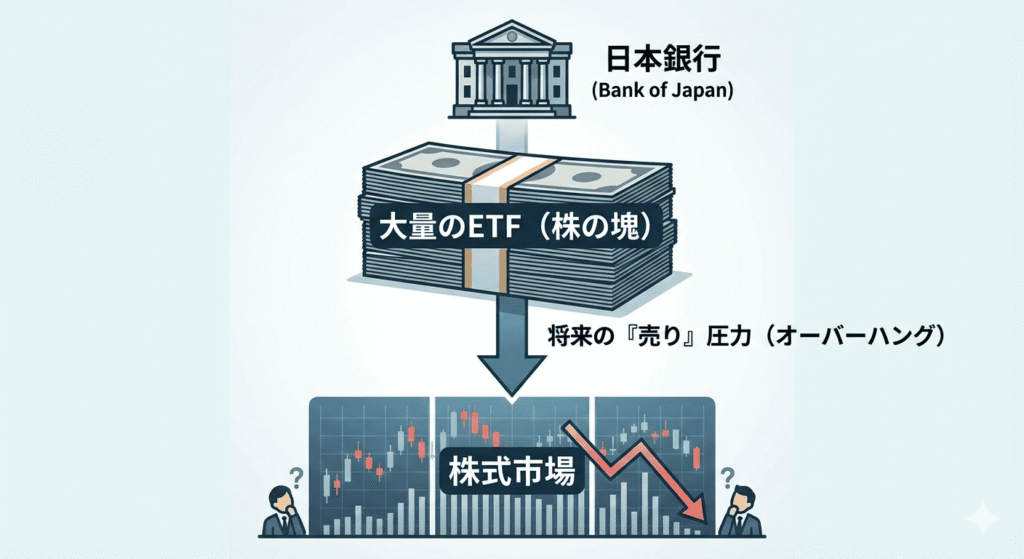 - 図のように、日銀が保有する巨大な株の塊(ETF)が市場に放出されると、供給過剰になり株価が下がりやすくなります。