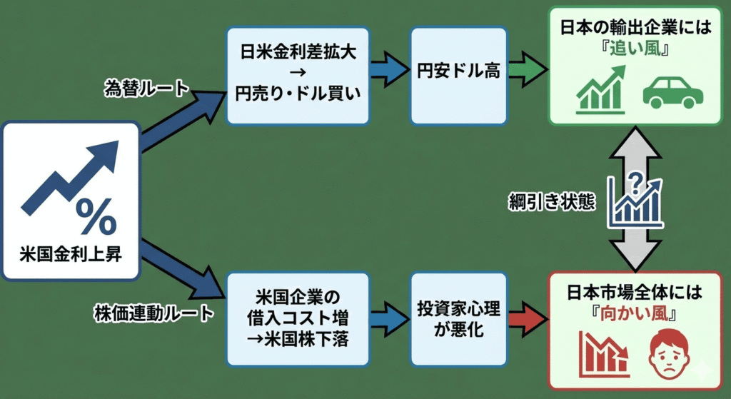 米国の金利が上がると、日本株には「プラスの風」と「マイナスの風」が同時に吹くことになります。その仕組みを図解で見てみましょう。