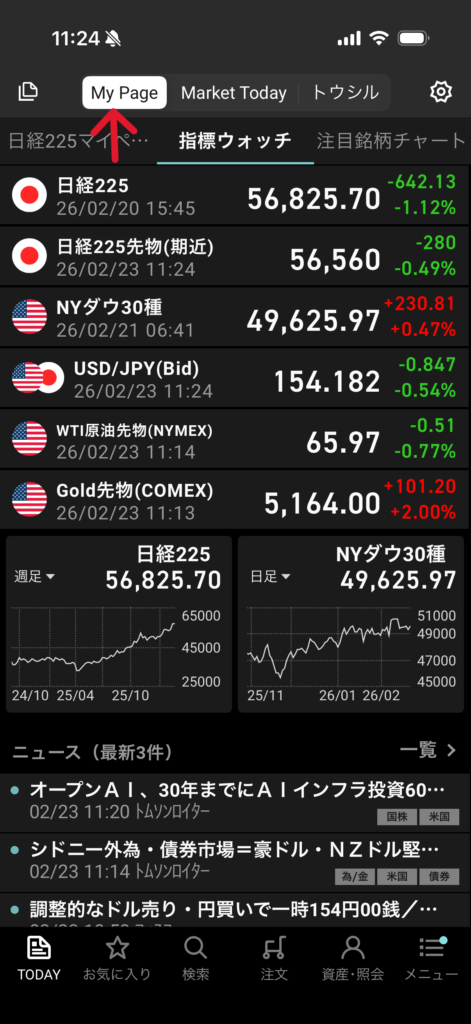 1. アプリ下のメニュー「TODAY」から画面上部の「My Page(マイページ)」タブをタップ