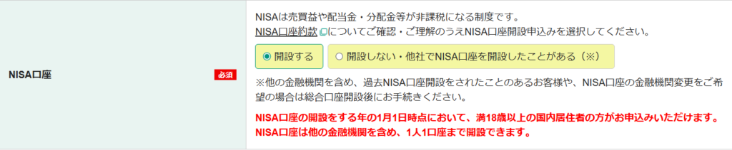 口座開設時に「NISA口座を同時に開設する」にチェックを入れるだけでOK。